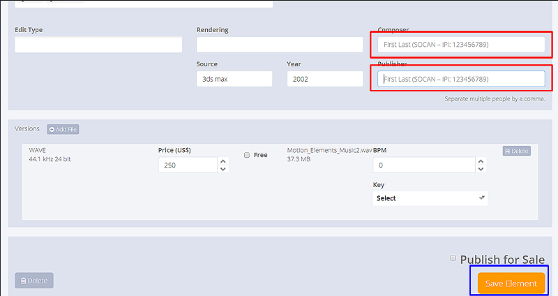 메타데이터 파일에서 작곡가(Composer) 및 발행인(Publisher)에 대한 필드를 생성하여 메타데이터에 P.R.O. 세부정보를 입력할 수도 있습니다.